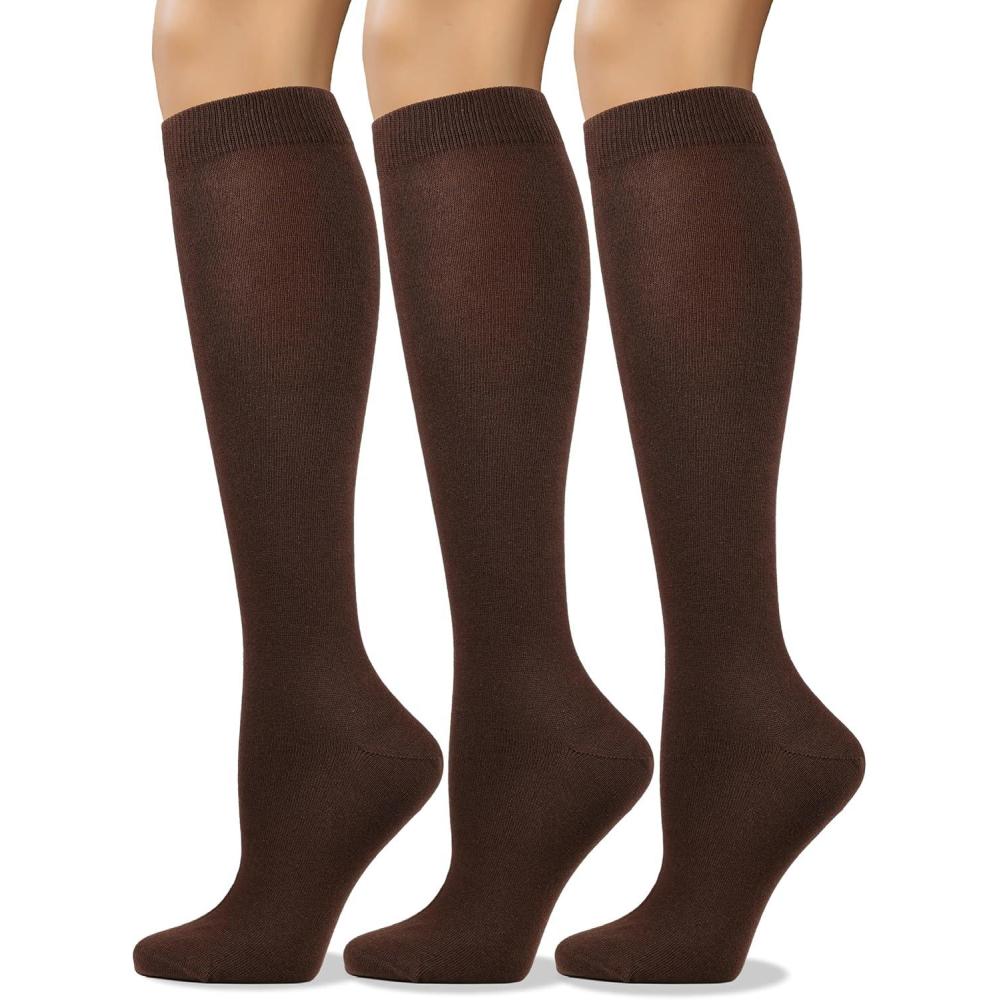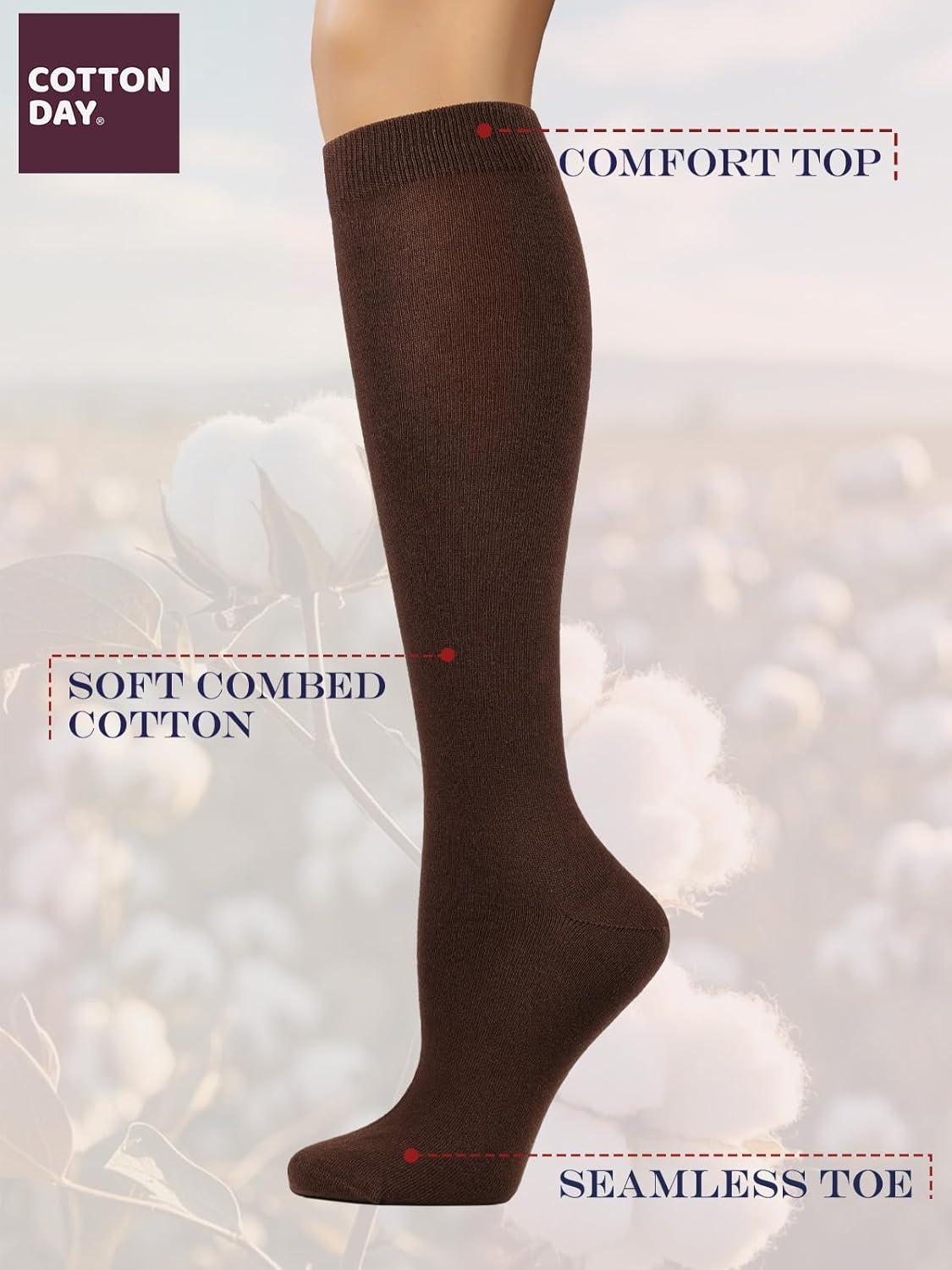COTTON DAY Women's Soft Combed Cotton Knee High Long Calf Dress Socks Seamless Toe Black White Gray Navy Blue Brown(Plain Brown Cocoa)